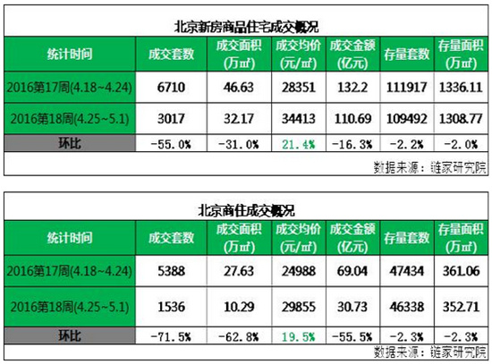 從價(jià)格來(lái)看,2016年五一小長(zhǎng)假期間(4月30日-5月2日)北京商品住宅成交均價(jià)高達(dá)34005元/平方米,這一成交價(jià)格也創(chuàng)造了歷史同期新高。另?yè)?jù)鏈家研究院數(shù)據(jù)顯示,4月末周(4.25~5.1)北京商品住宅成交均價(jià)環(huán)比上周上漲21.4%,每平米漲價(jià)6062元,商住成交均價(jià)每平米上漲了4867元。