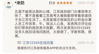 “五星不能表達(dá)我的心情,江蘇政府部門辦事效率太快了,要不是看著江蘇高考太難,我都想帶著老婆孩子去江蘇生活了。”江蘇政務(wù)服務(wù)APP用戶“某來防”用過“公積金提取”應(yīng)用后,給了個五星評價,順帶夸贊了宿遷宿城區(qū)公積金辦事人員。