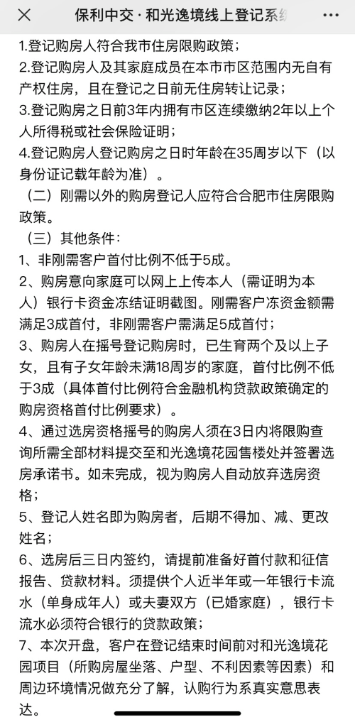 記者注意到,和光逸境小區(qū)5月23日10:00開始進(jìn)行G2幢,G5幢,G3幢新房公開銷售登記。而在登記條件中,已經(jīng)明確購房意向家庭可以網(wǎng)上上傳本人(需證明為本人)銀行卡資金凍結(jié)證明截圖。剛需客戶凍資金額需滿足3成首付,非剛需客戶需滿足5成首付。上面還明確寫著,購房人在搖號登記購房時(shí),已生育兩個(gè)及以上子女,且有子女年齡未滿18周歲的家庭,首付比例不低于3成(具體首付比例符合金融機(jī)構(gòu)貸款政策確定的購房資格首付比例要求)。
