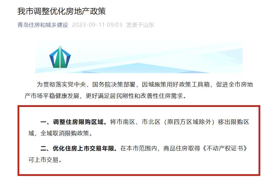 人民網(wǎng)濟(jì)南9月11日電(記者 聶俊穹)11日,據(jù)青島住房和城鄉(xiāng)建設(shè)微信公眾號(hào)消息,為貫徹落實(shí)黨中央、國(guó)務(wù)院決策部署,因城施策用好政策工具箱,促進(jìn)青島市房地產(chǎn)市場(chǎng)平穩(wěn)健康發(fā)展,更好滿足居民剛性和改善性住房需求。