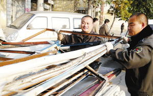 當日上午,20余名城管隊員來到位于火花辦事處轄區(qū)的三環(huán)西路路東的“劉家把子肉”館和一家無名羊肉館。記者在現(xiàn)場看到,這兩處餐館的店面污漬斑斑,店內桌椅破舊不堪,店堂上方懸掛的“羊肉館”、“把子肉”自制廣告牌不規(guī)范,城管隊員拆除了這兩處違規(guī)廣告。