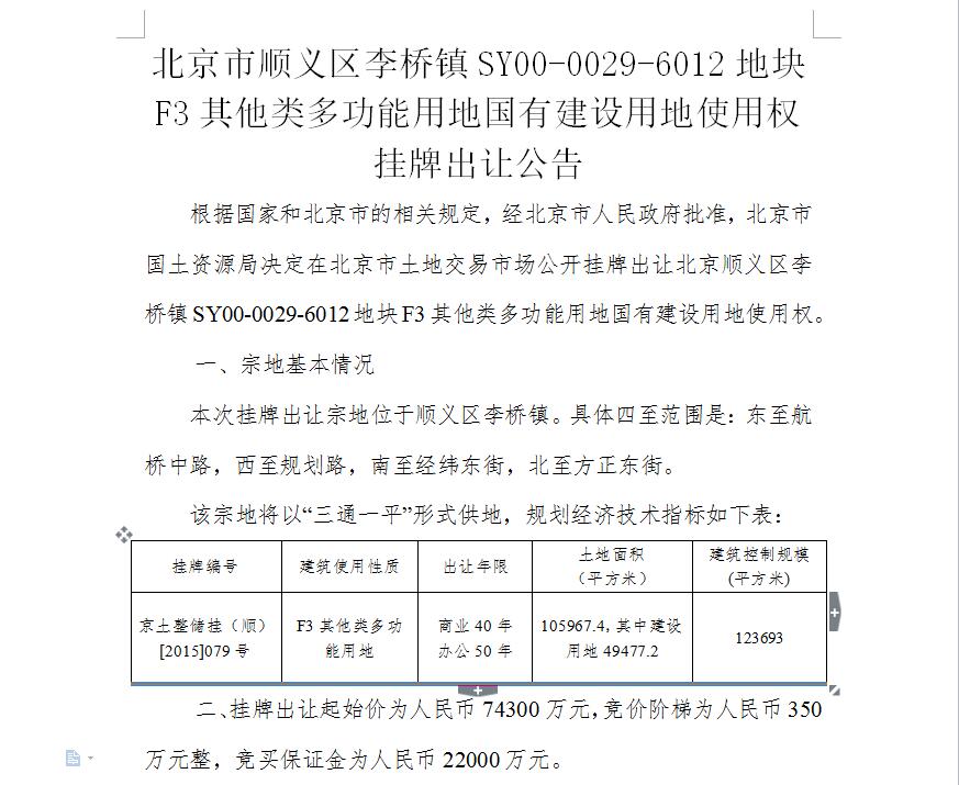 北京順義區(qū)李橋鎮(zhèn)SY00-0029-6012地塊F3其他類(lèi)多功能用地掛牌文件