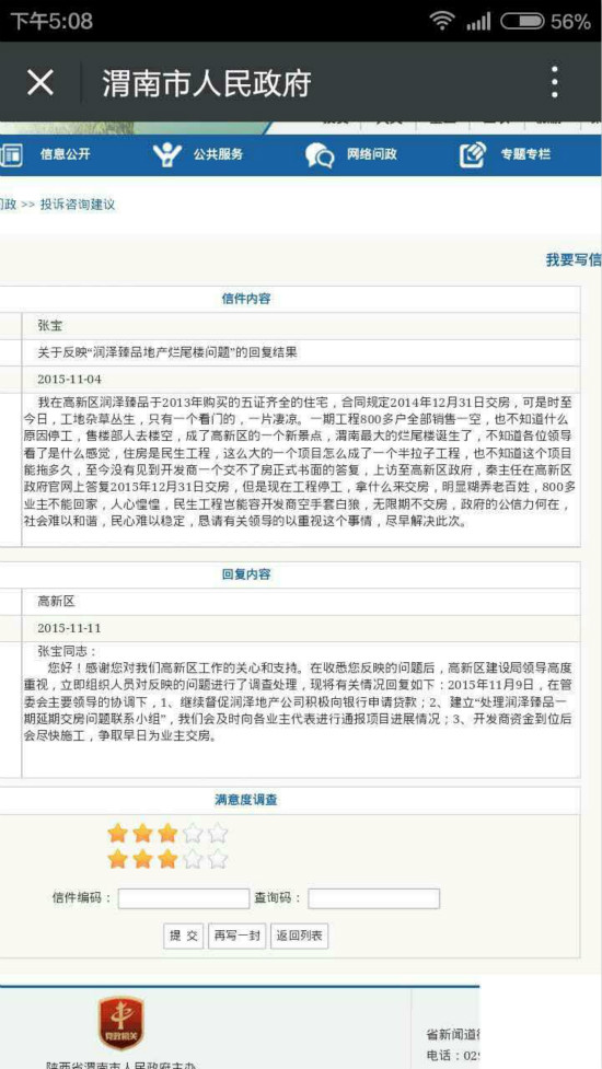 1、陜西省渭南市潤(rùn)澤臻品開發(fā)商延期一年多未交房,840戶業(yè)主無家可歸。投訴人:田先生