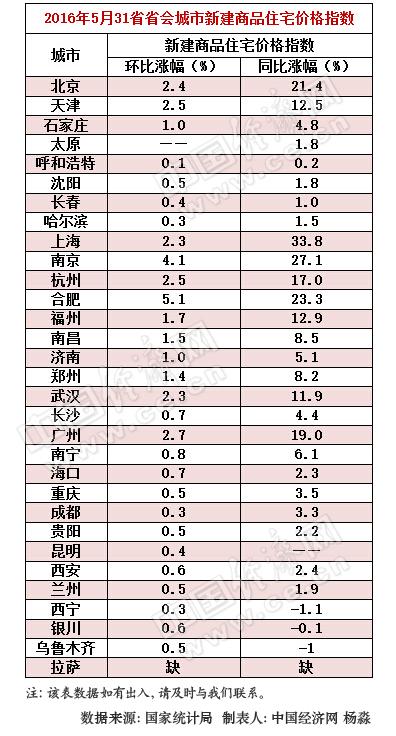 從表格來看,今年5月31省省會(huì)城市新建商品住宅價(jià)格指數(shù)與2015年比較,北京、上海、合肥、南京在內(nèi)的4個(gè)城市房?jī)r(jià)的同比增長(zhǎng)幅度比較大,分別增長(zhǎng)了21.4%、33.8%、23.3%、27.1%,漲幅均超過20%。中國(guó)經(jīng)濟(jì)網(wǎng)發(fā)現(xiàn),與去年相比,房?jī)r(jià)同比跌幅最大的城市是西寧,跌幅為1.1%。
