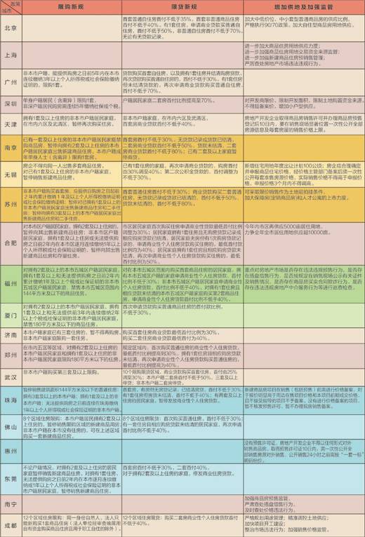 限購。在本輪出臺調(diào)控新政的城市中,基本都涉及重啟或擴大限購。比如南京規(guī)定,已有一套及以上住房的非本市戶籍居民家庭禁購商品住房,暫停向擁有2套及以上住房的本市戶籍居民家庭出售新建商品住房,本市戶籍成年單身人士(含離異)限購1套房。無錫則要求房企不得向同一人出售多套商品住房,對已有1套及以上住房的非本市戶籍家庭,暫停銷售新建商品住房。