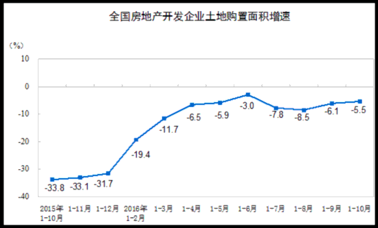 1-10月份,房地產(chǎn)開發(fā)企業(yè)土地購置面積16873萬平方米,同比下降5.5%,降幅比1-9月份收窄0.6個(gè)百分點(diǎn);土地成交價(jià)款6764億元,增長(zhǎng)16.7%,增速提高3.4個(gè)百分點(diǎn)。