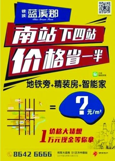 昨日在微信朋友圈上刷屏的這兩家樓盤,一是江寧正方新城的銀城藍溪郡,一是祿口板塊的招商依云郡,均為各自區(qū)域內(nèi)的熱點項目,主打的也都是剛需買家。銀城藍溪郡在廣告單頁上的推廣語為“南站下四站,價格省一半”,并附上了區(qū)位圖還有“地鐵旁、精裝房、智能家”的字樣,不過在價格上卻打了個大大的問號,原來這家尚未開盤的項目“懸賞”1萬元讓買家猜價格。另一家樓盤招商依云郡的廣告語為“南站向南五站,價格狂省大半”,開發(fā)商也標(biāo)注了“學(xué)區(qū)房、戶型王、地鐵旁”的幾大賣點,房價則為8999元/㎡起售。