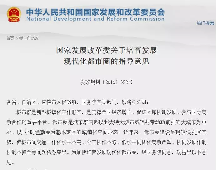 21日,國家發(fā)展改革委對外發(fā)布了關(guān)于培育發(fā)展現(xiàn)代化都市圈的指導(dǎo)意見。意見提出,到2022年,都市圈同城化取得明顯進(jìn)展,基礎(chǔ)設(shè)施一體化程度大幅提高,阻礙生產(chǎn)要素自由流動的行政壁壘和體制機(jī)制障礙要基本消除。