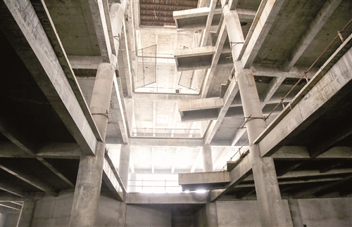 穿越展廳,進(jìn)入中央國(guó)際廣場(chǎng)施工現(xiàn)場(chǎng),可以看到,雖停工多年,但建成的五層主體結(jié)構(gòu)完好。整棟大樓主要是混凝土和鋼構(gòu),一層密密麻麻數(shù)百根直徑約1.2米的巨型圓柱支撐起整棟綜合體。綜合體北側(cè)和西側(cè)各有兩座約30米高的塔吊,五層主體之上還有一座塔吊,一直沒(méi)有拆除。