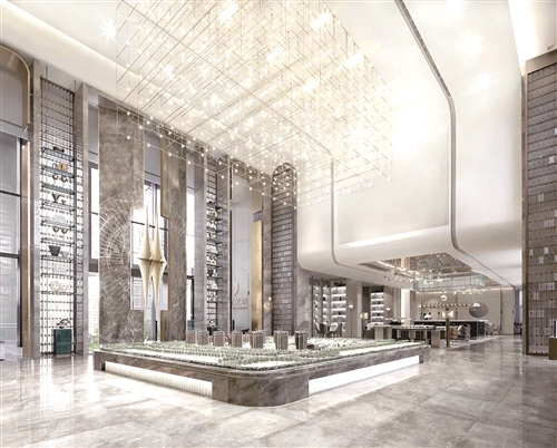 進(jìn)入大廳,首先映入眼簾的是挑高天花板搭配金屬架構(gòu)結(jié)合燈光的藝術(shù)裝置,創(chuàng)造出璀璨星云般的效果,整體結(jié)構(gòu)雖然龐大,但與入口處雙星裝飾呼應(yīng)的纖薄金屬框架則消除了普通吊頂?shù)膲阂指校S持深度空間感的同時(shí)也為整體方案帶來(lái)彗星云集般的寓意。