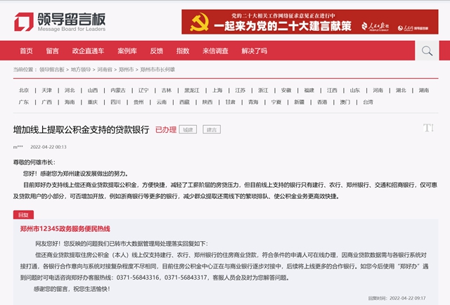 “‘鄭好辦’支持線上償還商業(yè)貸款提取公積金,方便快捷,減輕了工薪階層的房貸壓力,但目前支持的銀行只有建行、農(nóng)行、鄭州銀行、交通和招商銀行,僅可惠及貸款用戶的小部分,可否增加開放?”近日,河南鄭州市民費女士給鄭州市市長留言,希望鄭州市政府主辦的城市綜合運營平臺“鄭好辦”APP能上線更多銀行,以減少群眾線下排隊的繁瑣,使公積金提取業(yè)務更高效快捷。