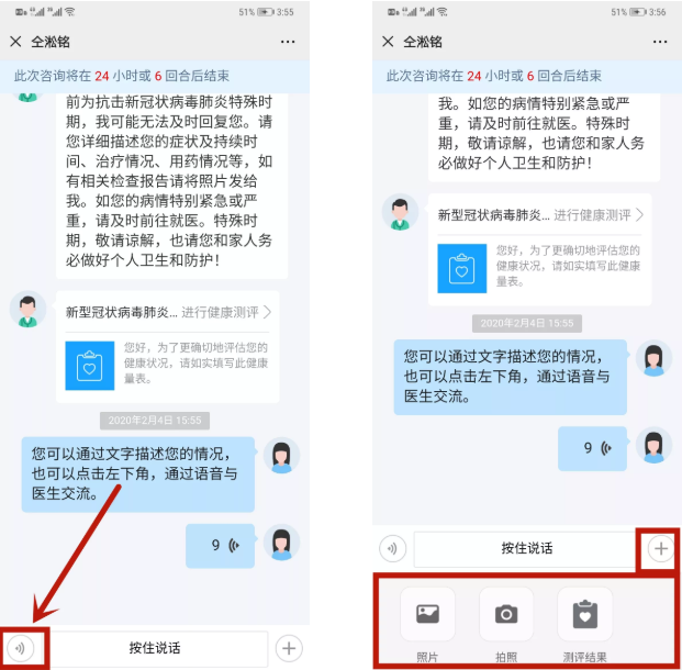溫馨提示:您可以通過(guò)文字描述您的情況,也可以點(diǎn)擊左下角,通過(guò)語(yǔ)音與醫(yī)生交流。點(diǎn)擊右下角“+”,可以傳送照片、測(cè)評(píng)結(jié)果等發(fā)給醫(yī)生。