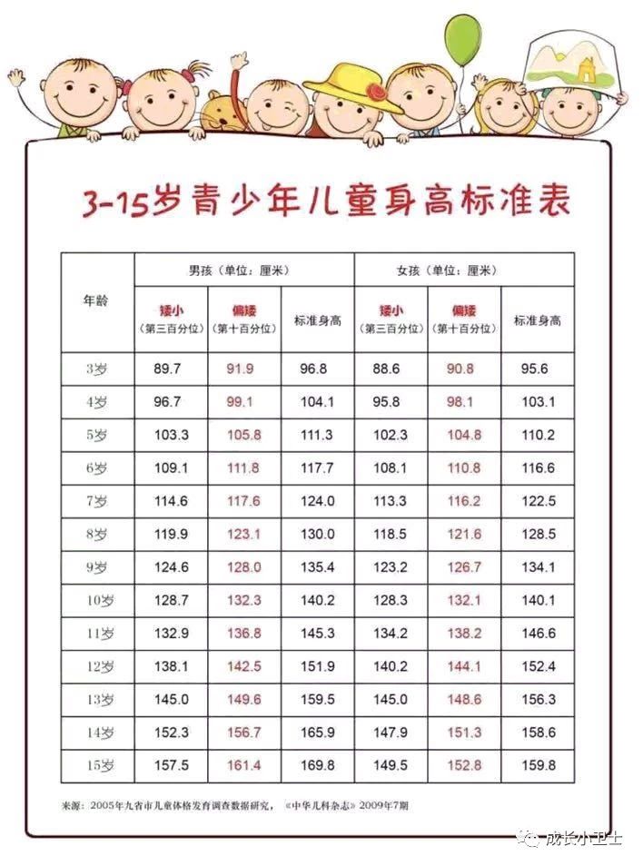 1、孩子身高明顯落后:3歲低于90cm,4歲低于97cm,5歲低于103cm,6歲低于109cm,7歲低于115cm,8歲低于120cm,9歲低于125cm,10歲低于129cm,11歲男童低于133cm,女童低于135cm;12歲男童低于138cm,女童低140cm;13歲(女童)低于145cm;14歲男童低于153cm,女童低于148cm;15歲男童低于158cm。