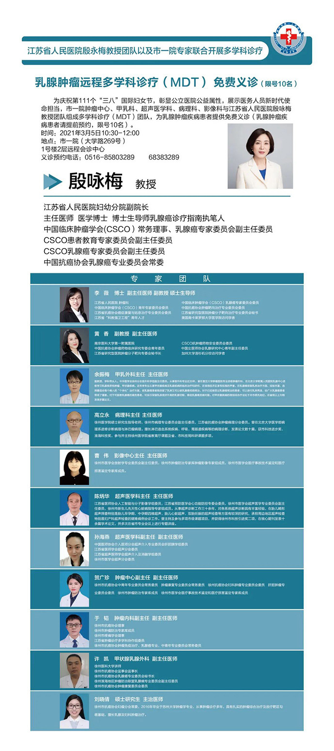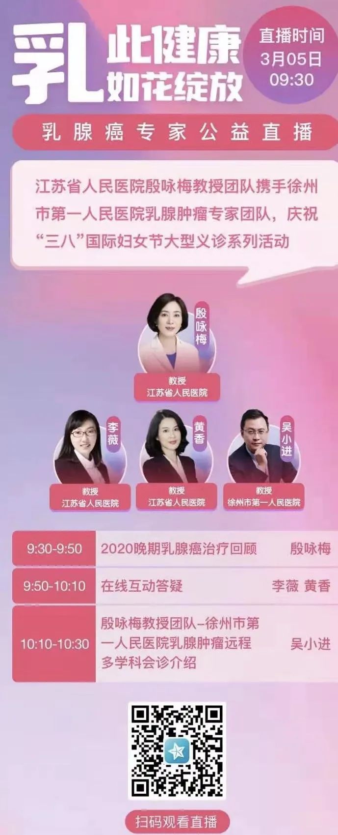 3月5日,江蘇省人民醫(yī)院殷詠梅教授團(tuán)隊將攜手徐州市一院乳腺腫瘤專家團(tuán)開展大型義診及健康公益直播活動