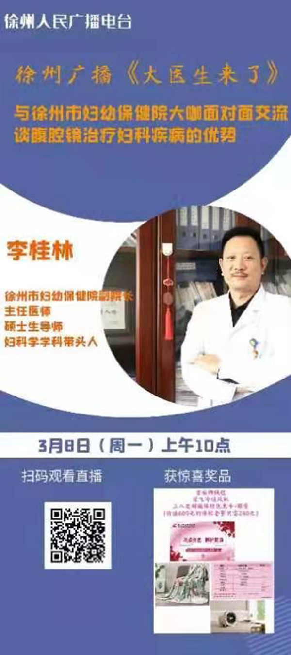黃淮網(wǎng) 徐州廣播攜手徐州市婦幼保健院在今天上午10:00直播“三·八”特別節(jié)目,徐州市婦幼保健院李桂林副院長上線直播間,與大家聊一聊腹腔鏡治療婦科疾病等相關(guān)話題,直播間將有多輪驚喜大禮等著你~