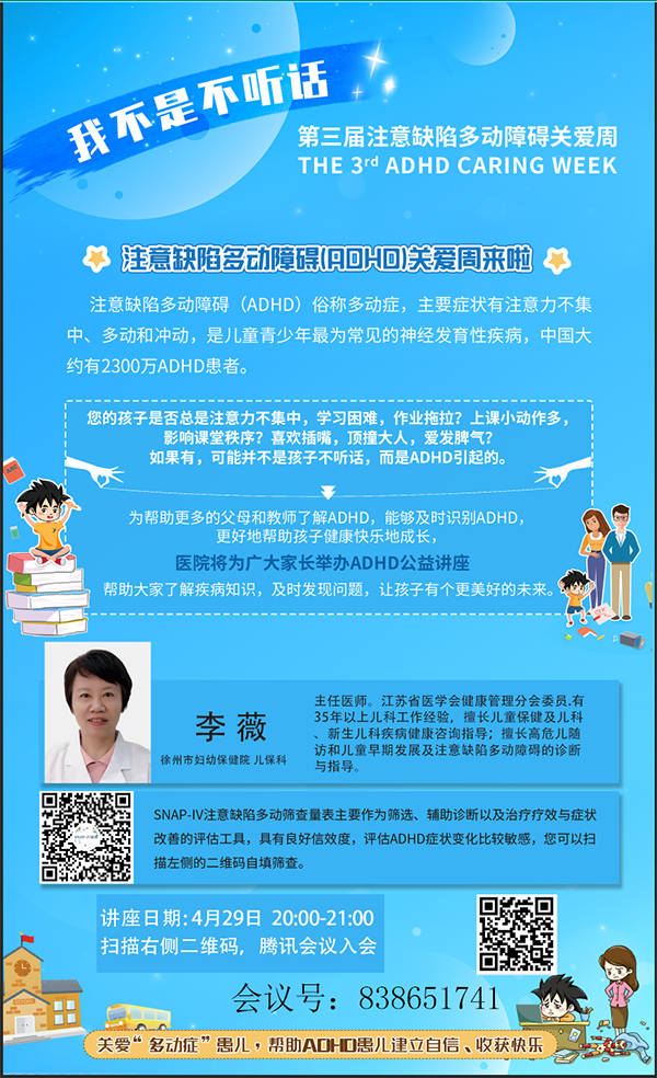 4月26日至5月2日是第三屆注意缺陷多動障礙關(guān)愛周,為全面提升社會各界對ADHD的認(rèn)知,關(guān)注中國青少年人群心理健康問題,呼吁公眾關(guān)注、關(guān)愛ADHD患兒,呵護孩子們的身心健康全面發(fā)展,徐州市婦幼保健院兒童保健科心理衛(wèi)生(學(xué)習(xí)困難)門診將于4月29日開展線上系列科普講座及線下義診。