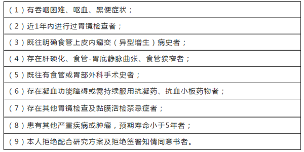 年齡為40歲及以上,符合下列條件之一,強烈推薦每年定期做食管細胞篩查。(1)出生或長期居住于食管癌高發(fā)區(qū);(2)一級親屬(父母、子女以及親兄弟姐妹)有食管癌病史;(3)本人有頭頸部腫瘤病史;(4)其他食管癌高危因素:熱燙飲食、飲酒、吸煙、進食過快、牙齒缺失、室內(nèi)空氣污染等。