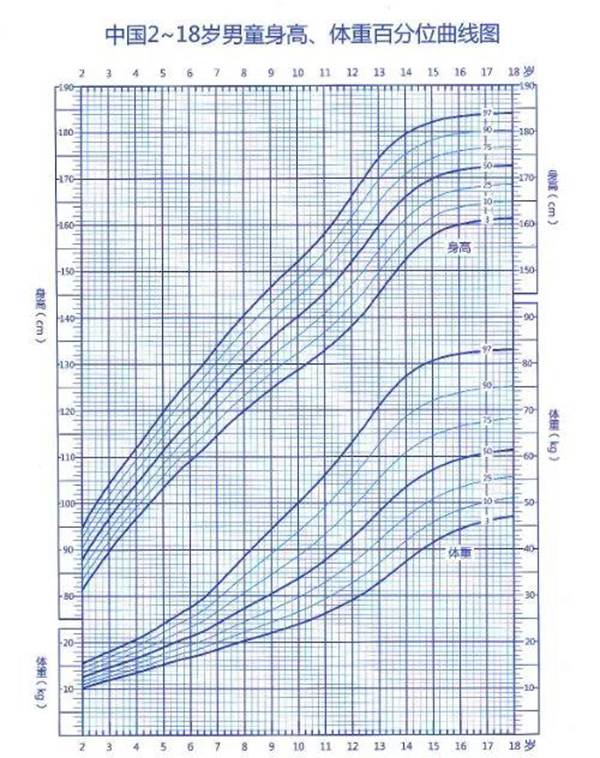 首先我們會拿出一張身高、體重百分位曲線圖(或者標準差圖),這張圖是將全國某年齡組的男孩或女孩,按身高/體重的數(shù)值由小到大排列起來,小的百分位數(shù)值低,大的百分位數(shù)值高,常分為第3、10、25、50、75、90、97百分位數(shù),因此各有7條曲線,同時將孩子的發(fā)育情況分為五個不同的等級:高大為≥P97,中上等為P75-P97,中等為P25-P75,中下等為P3-P25,矮小為≤P3。