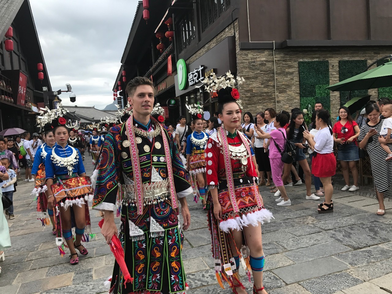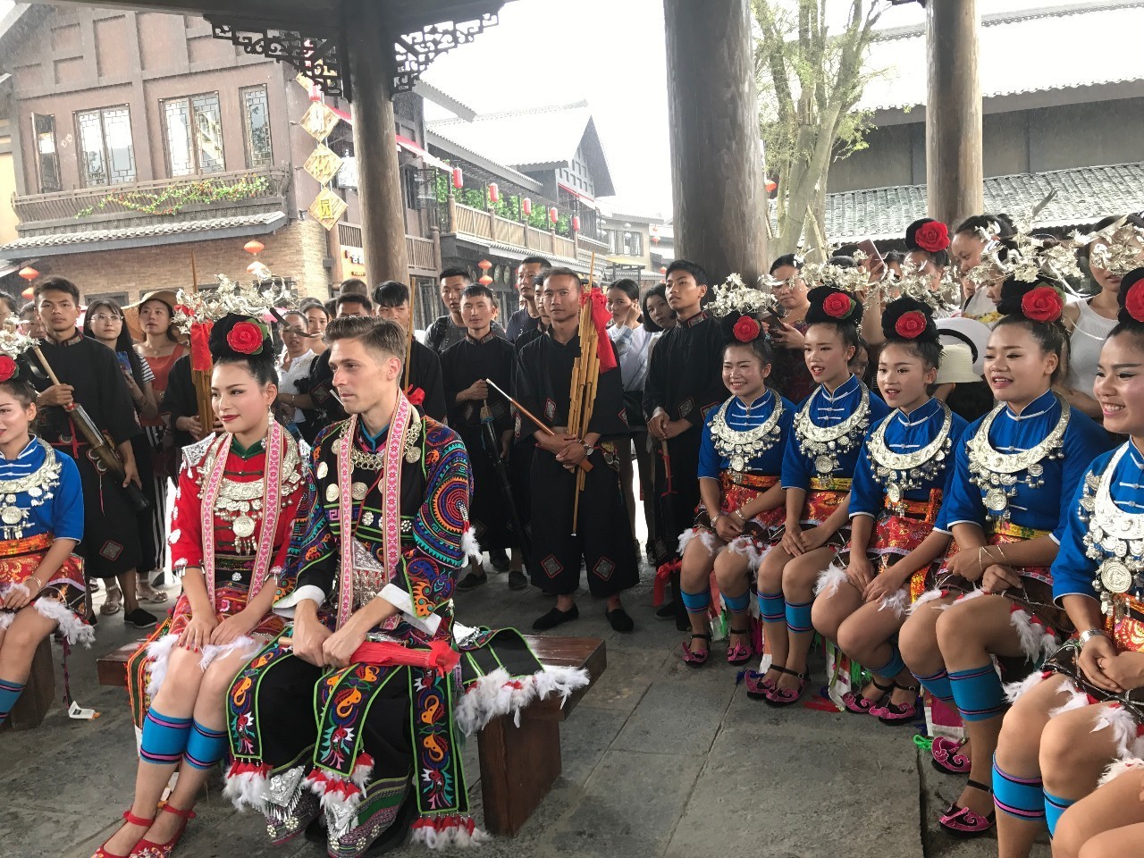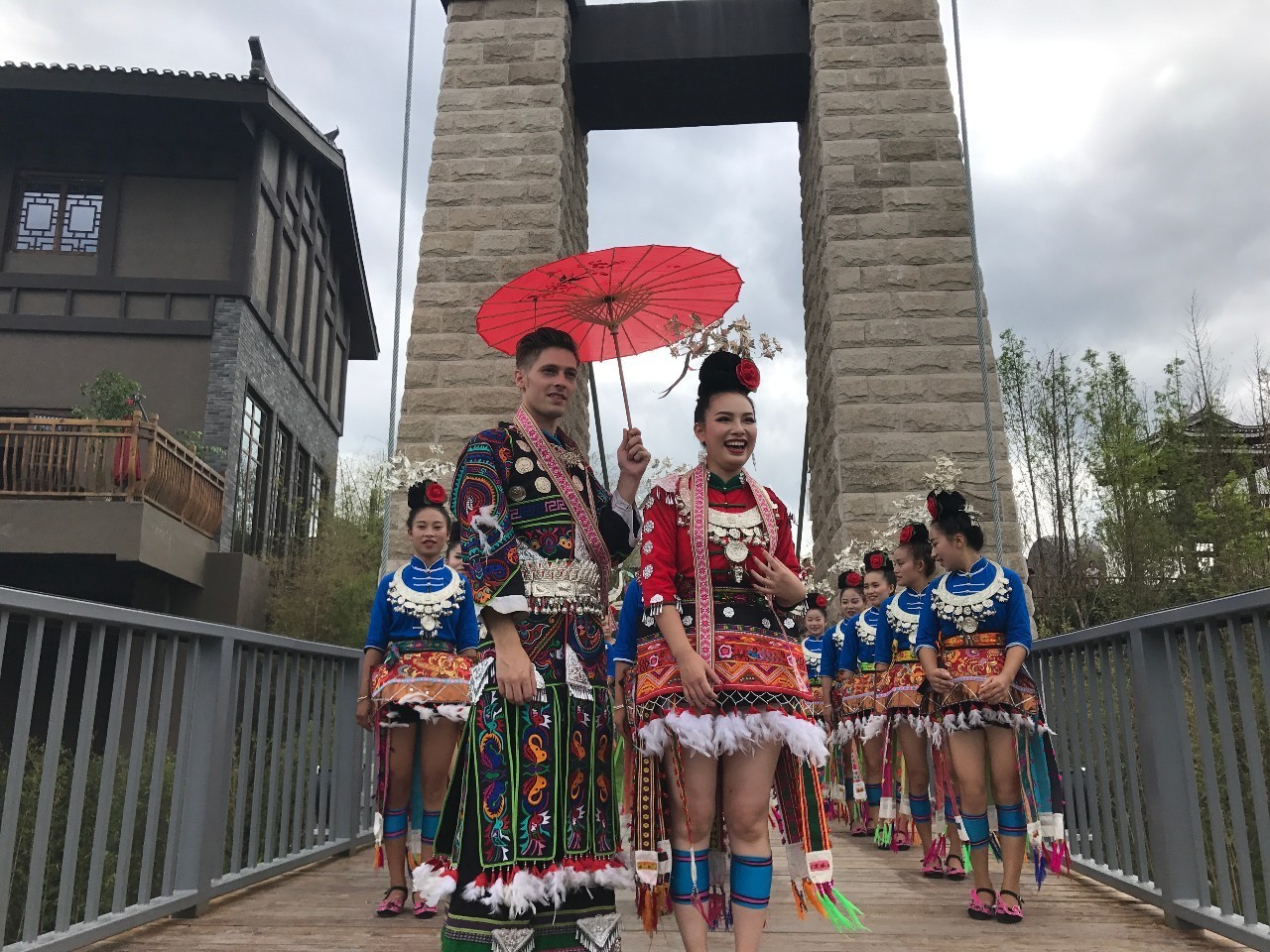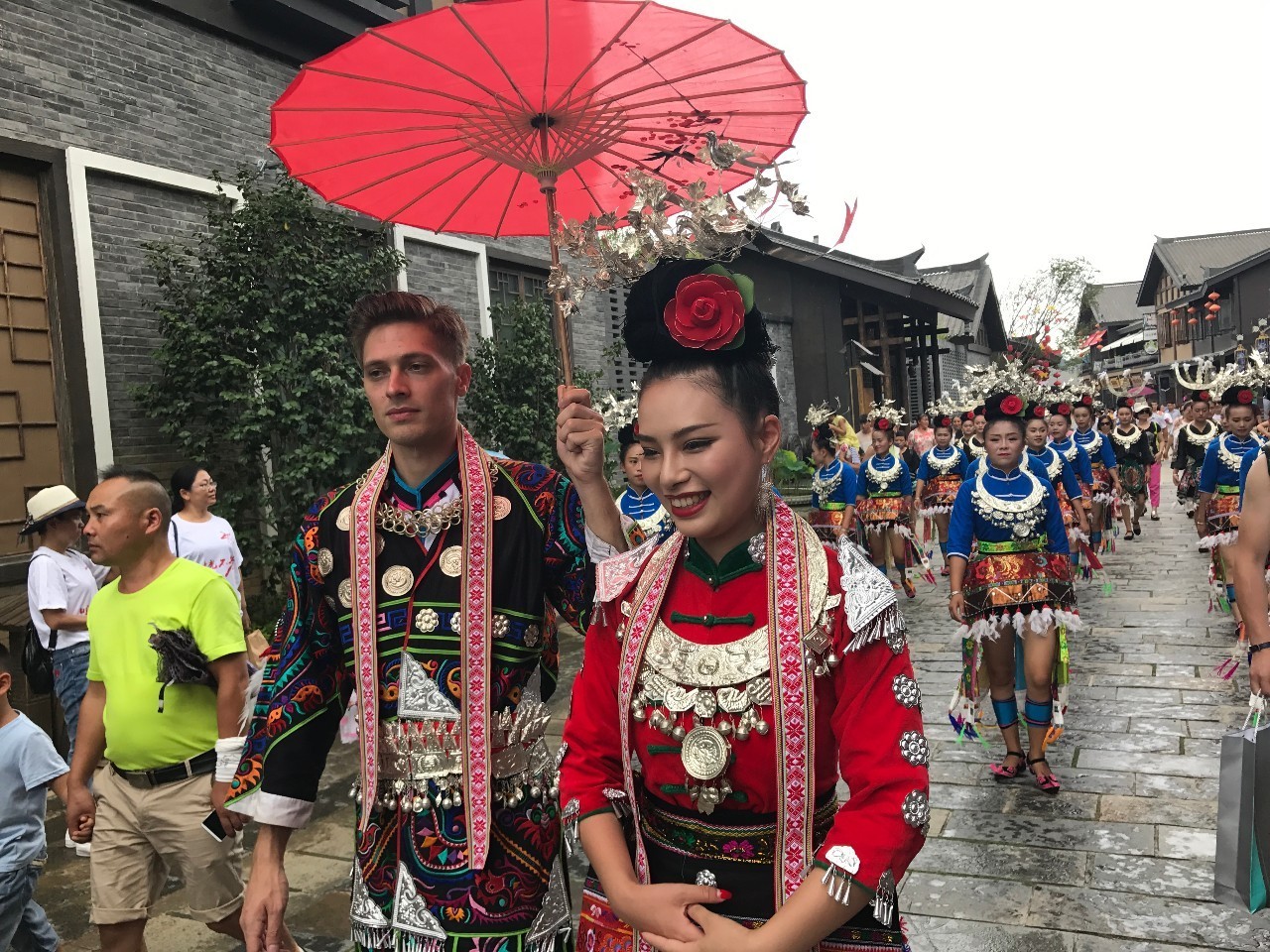 8月6日(周日),英國網(wǎng)紅男模、丹寨萬達旅游小鎮(zhèn)第五任“輪值鎮(zhèn)長”埃德蒙·恩斯頓與小鎮(zhèn)第四任“輪值鎮(zhèn)長”、美女廣播主持周叢嫻,在小鎮(zhèn)舉辦了一場大型苗族婚禮秀。