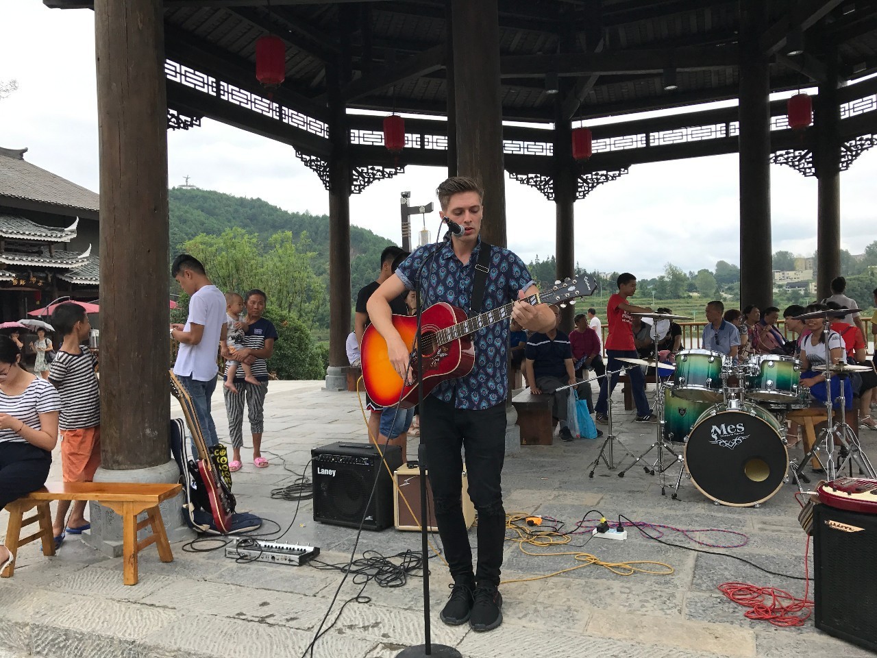 2、親自抱上吉他,和當?shù)貥逢犚黄鹪趶V場舉辦“露天演唱會”。