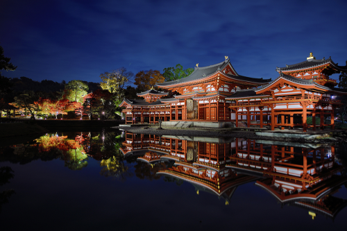 秋季平等院的特別參拜可以觀賞到平等院的夜景風(fēng)光。在燈光的照映下,池尾水面上的阿彌陀如來的坐像和漂浮的紅葉相得益彰。去年,僅9天的夜間參拜就有近4萬名游客慕名共襄這一盛景。