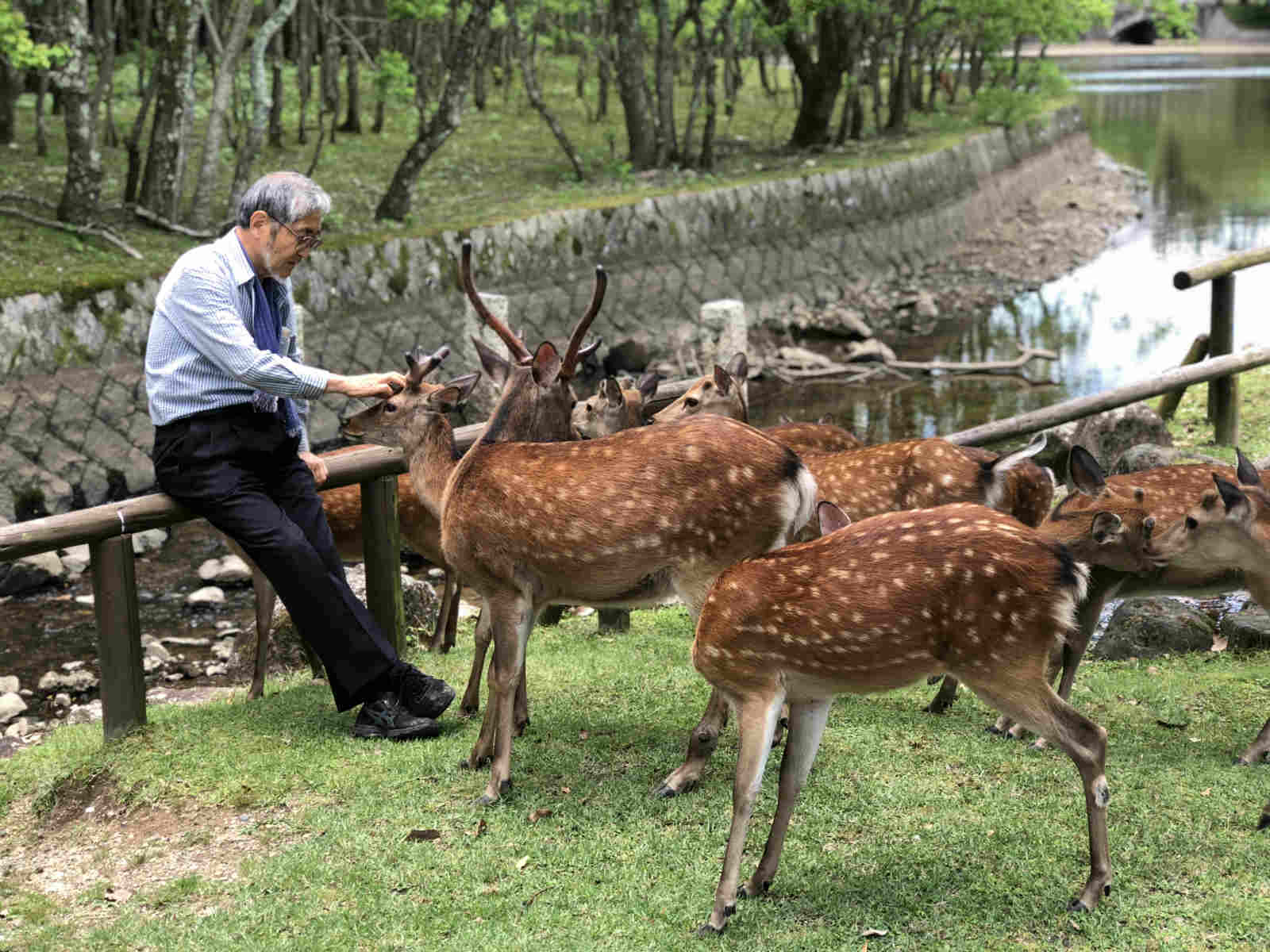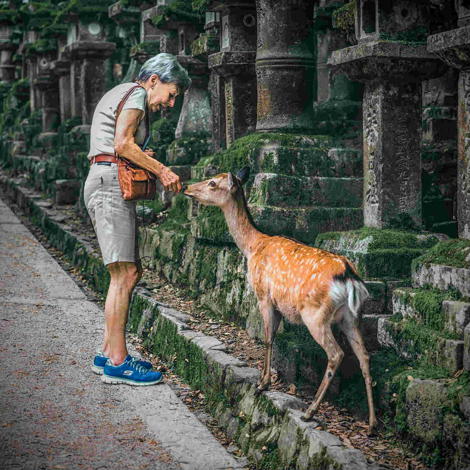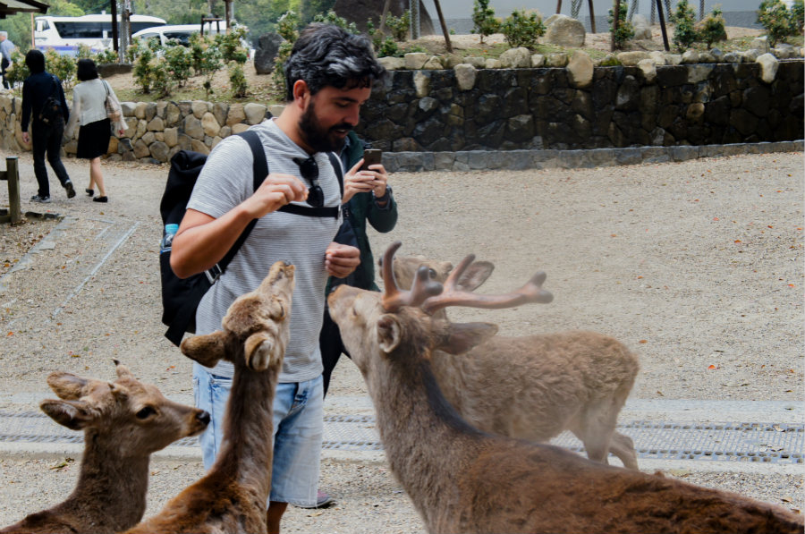 奈良鹿分為生活在公園平地的“公園鹿”和生活在山上的“若草山鹿”兩種,它們是野生動物,會自己尋找食物,以青草為主。如果想喂小鹿,可以購買“鹿餅”,這是由小麥粉和米糠制作而成,不含糖等添加物。而不能隨意投喂其他食品,以免給小鹿造成健康問題。另外,地圖、紙巾等也要收好,以免被小鹿誤食。為了防止在喂食過程中被小鹿咬傷,不要把鹿餅掰成小塊或者拿食物戲弄。