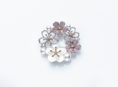 這是阪急百貨店5樓MIKIMOTO的胸針。惹人憐愛的櫻花色別出心裁的搭配上白蝶貝、鉆石、白金以及Akoya珍珠,平添華麗纖細感的精巧設(shè)計感。