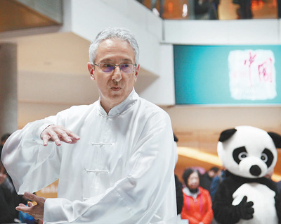 圖為當(dāng)天,在法國巴黎拉德芳斯四季購物中心,一名法國老人在“美麗中國”活動中表演太極拳。