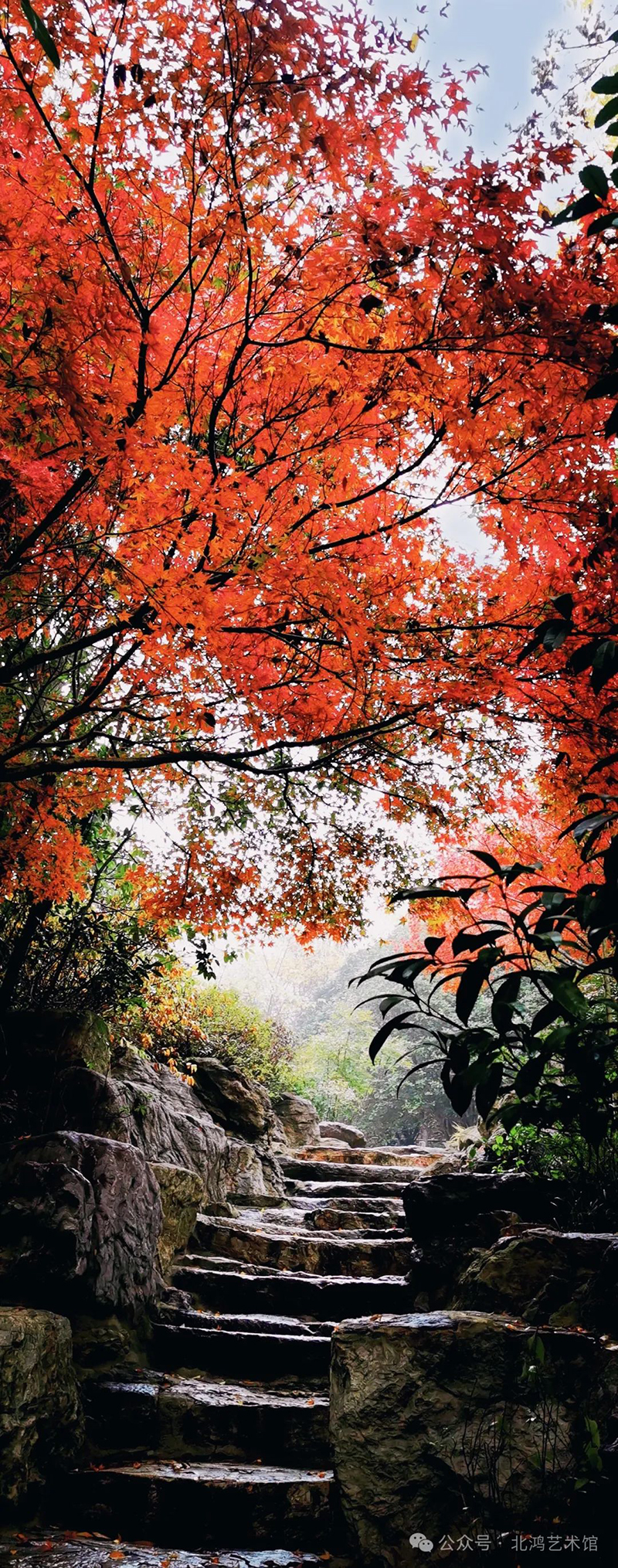 抬頭仰望,天空如同一幅淡雅的水墨畫,淡淡的藍(lán)色與地面的秋色形成了鮮明的對比,宛如天地的對話,和諧而寧靜。陽光透過樹葉的縫隙,灑在石階小徑上,斑駁的光影如同時間的碎片,為整個畫面增添了幾分夢幻與浪漫。