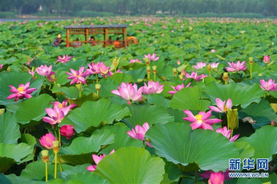 7月12日,游客在河北省灤南縣北河公園內(nèi)乘船觀賞荷花。盛夏時節(jié),河北省灤南縣北河公園里荷花競相綻放,進入最佳觀賞期,吸引了眾多游客和市民前來觀賞。 新華社記者 牟宇 攝