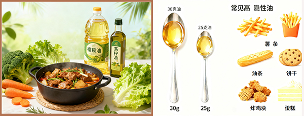科學(xué)控油的核心在于選對(duì)油品、合理食用且適量攝入。建議優(yōu)選植物油,并識(shí)破食物中的隱性油脂。推薦使用橄欖油、茶籽油(富含單不飽和脂肪酸)、山茶油、低芥酸菜籽油進(jìn)行涼拌或快炒,同時(shí)可搭配亞麻籽油、紫蘇籽油(富含Omega-3)用于涼拌。應(yīng)限制攝入豬油、黃油、奶油等飽和脂肪以及人造黃油、起酥油等反式脂肪。根據(jù)《中國(guó)居民膳食指南》的建議,每人每天烹調(diào)油的攝入量應(yīng)控制在25~30克,約相當(dāng)于白瓷勺 2-3平勺。此外,還需警惕烘焙糕點(diǎn)(如酥皮點(diǎn)心、餅干、蛋撻)、加工零食(如薯片、膨化食品),紅燒、干鍋、油炸、干煸類菜肴以及肥肉、肉皮、動(dòng)物內(nèi)臟等隱性油脂來(lái)源。