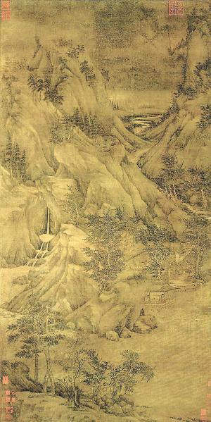 張蔚星告訴記者,董元的官職是北苑副使,北苑所指現(xiàn)在尚無定論,比較流行的觀點(diǎn)認(rèn)為北苑是南唐皇室的私家園林,董元大致相當(dāng)于園林管理局的副局長,因此歷史上又稱他“董北苑”。北宋統(tǒng)一南方時(shí),董元已去世,他的和尚徒弟巨然隨后主李煜去了汴梁,也帶去了董元開創(chuàng)的南方山水畫派,轟動(dòng)一時(shí),F(xiàn)在被認(rèn)為是董元的傳世作品約有七八幅,當(dāng)時(shí)畫家作畫一般不署名,而《溪岸圖》是唯一有落款的,曾被南宋權(quán)臣賈似道收藏,明代又進(jìn)入皇家內(nèi)府!断秷D》的山石是唐代以來的層層渲染技法,而沒有使用董元首創(chuàng)的披麻皴,因此方聞才認(rèn)為這是董元早期作品。