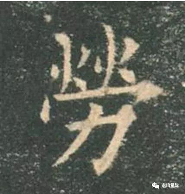 “勞”的上部?jī)蓚(gè)“火”大小不一,都向左斜。