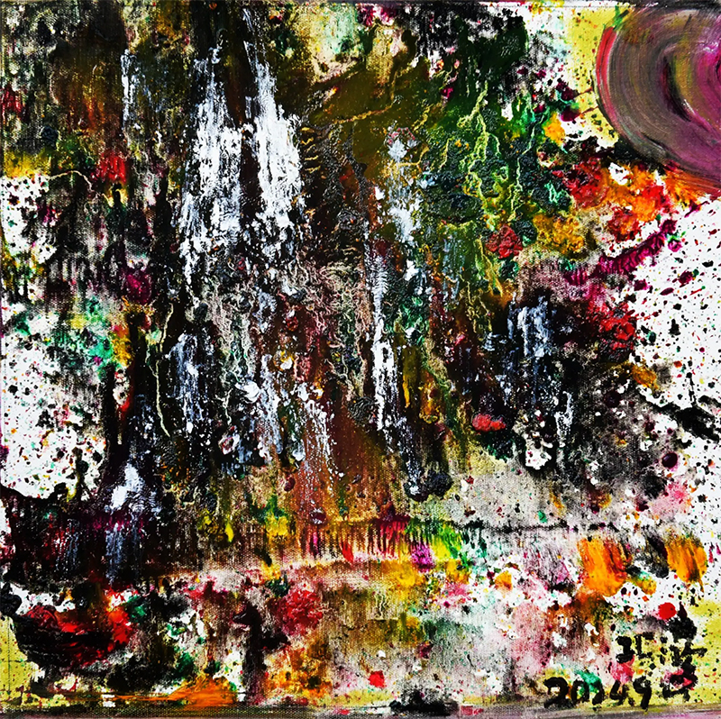 北鴻運(yùn)用其獨(dú)特的潑灑油彩和飛動(dòng)筆勢(shì)技法,將飛流直下的瀑布與情人的堅(jiān)定情感相結(jié)合。他們一同欣賞飛流直下的瀑布,感受著大自然的磅礴與力量,也讓他們的愛情更加堅(jiān)定與執(zhí)著。