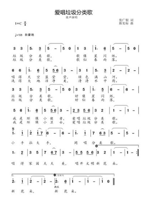 垃圾分類歌,好像星閃爍,照得天空藍(lán)瑩瑩,綠色滿山河。我是環(huán)保小使者,愛唱垃圾分類歌。