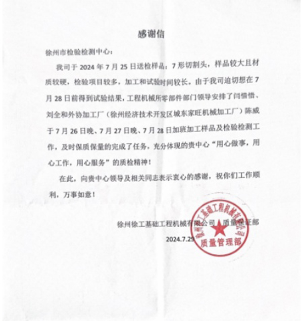 黃淮網(wǎng) 近日,徐州市檢驗(yàn)檢測(cè)中心【國(guó)家工程機(jī)械質(zhì)檢中心(江蘇)(籌)、省智能工程機(jī)械產(chǎn)業(yè)計(jì)量中心(籌)、省市場(chǎng)監(jiān)管重點(diǎn)實(shí)驗(yàn)室(工程機(jī)械智能控制安全)】收到來(lái)自徐州徐工基礎(chǔ)工程機(jī)械有限公司(以下簡(jiǎn)稱“徐工基礎(chǔ)”)的感謝信,對(duì)中心快速響應(yīng)高效高質(zhì)完成切割頭等關(guān)鍵零部件檢驗(yàn)檢測(cè)以及指導(dǎo)改進(jìn)生產(chǎn)工藝、破解產(chǎn)品缺陷、提升產(chǎn)品質(zhì)量表示感謝。
