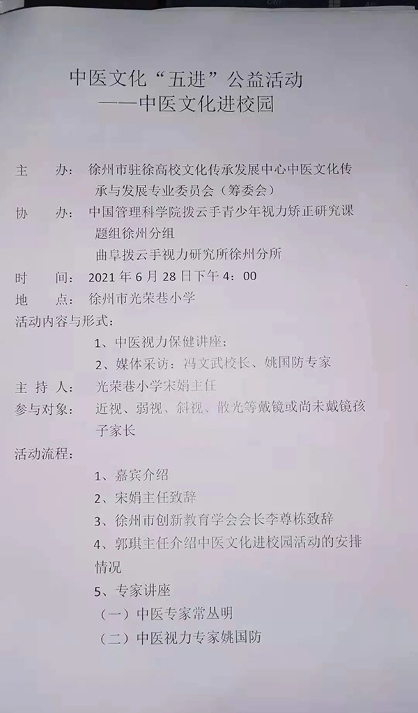 2021年6月28日在全國各族人民喜慶中國共產(chǎn)黨建黨100周年的時(shí)候,我們徐州市創(chuàng)新教育學(xué)會(huì)給我們的理事單位徐州市光榮巷教育集團(tuán)各位家長來了好的福音,本次活動(dòng)是由徐州市駐徐高校文化傳承發(fā)展中心與中醫(yī)文化傳承與發(fā)展專業(yè)委員會(huì)主辦,中國管理科學(xué)院撥云手青少年視力矯正研究課題組與山東省曲阜撥云手視力研究所徐州分所協(xié)辦的活動(dòng),徐州市光榮巷教育集團(tuán)小學(xué)張好然校長致辭,徐州市光榮巷教育集團(tuán)宋娟主任主持活動(dòng)。