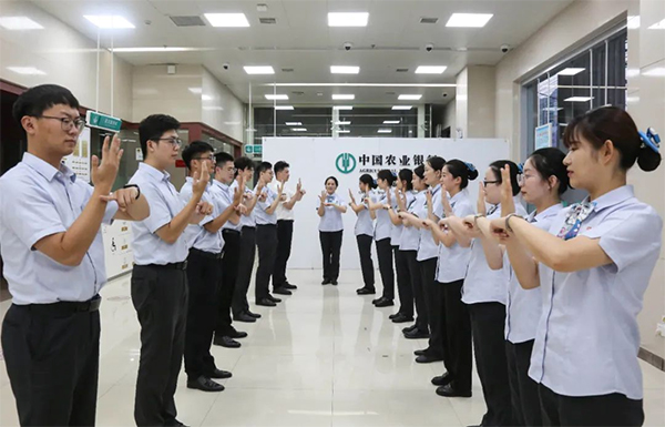 “以前何老師到哪個網(wǎng)點,聽障人士就跟到哪個網(wǎng)點,即使有同事跟何老師學習手語,也都是簡單零碎的學習,所以我就想著,一個人的力量是有限的,但一群人的力量是無限的,能不能把支行新入職的員工組織起來,由何老師帶領(lǐng)大家系統(tǒng)地學習一下手語,這樣的話,今后支行每一個網(wǎng)點都有人可以為這些聽障人士提供金融服務(wù)了。”曹方景介紹,在征得何玉梅的同意后,他立即組織了一批新入職不久的員工組成一個團隊,系統(tǒng)地跟隨何玉梅學習手語。
