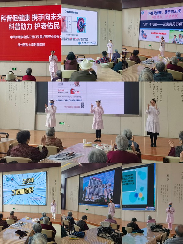 九如城康養(yǎng)中心云龍?jiān)菏且患壹t(yī)、康、養(yǎng)相融合的養(yǎng)老服務(wù)中心,高齡老人居多,部分老人長(zhǎng)期臥床不能自理。結(jié)合康養(yǎng)中心的特點(diǎn)和需求,徐醫(yī)附院?谱o(hù)士從專業(yè)角度向老人送上健康科普講座。泌尿外科護(hù)士長(zhǎng)王瓊講解老年尿失禁病人的護(hù)理管理;腎臟內(nèi)科護(hù)士長(zhǎng)劉穎通過(guò)生動(dòng)的圖畫與特色飲食模型,講解慢性腎臟病防治管理;骨科護(hù)士長(zhǎng)祝艷紅指導(dǎo)老人如何遠(yuǎn)離肩關(guān)節(jié)痛的困擾;神經(jīng)內(nèi)科護(hù)士長(zhǎng)拾丹丹、肖蓓和劉君君一起做了防治卒中的健康講座,現(xiàn)場(chǎng)指導(dǎo)老人學(xué)習(xí)健腦手指操;肝膽胰外科護(hù)士長(zhǎng)李靜簡(jiǎn)要講解了脂肪肝的成因和防治措施;肛腸科護(hù)士長(zhǎng)針對(duì)習(xí)慣性便秘的老人進(jìn)行健康指導(dǎo)。婦科護(hù)士長(zhǎng)王紅講解了如何預(yù)防宮頸癌。臺(tái)上臺(tái)下互動(dòng),現(xiàn)場(chǎng)氣氛非;钴S。