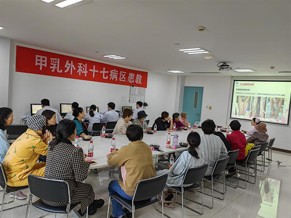黃淮網(wǎng) 每年的十月是“世界乳腺癌防治月”,又稱(chēng)粉紅絲帶月,倡導(dǎo)關(guān)愛(ài)女性健康,關(guān)注乳腺健康,旨在向全社會(huì)傳達(dá)“及早預(yù)防,及早發(fā)現(xiàn),及早治療”的理念。2023年10月25日下午,徐醫(yī)附院甲乳外科在東院17病區(qū)示教室舉辦美麗新生——粉紅絲帶月患者關(guān)愛(ài)公益活動(dòng)。