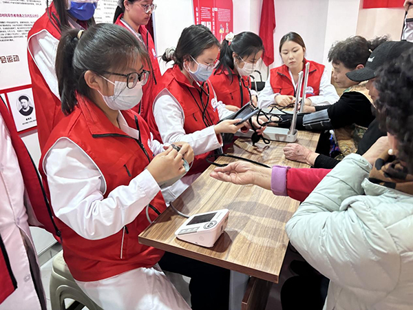 在健康檢測區(qū)域,第一臨床醫(yī)學院的志愿者們?yōu)榫用衩赓M測量血壓、心率、血氧飽和度等基礎(chǔ)健康指標,認真記錄每一項檢測數(shù)據(jù);針對指標檢測結(jié)果異常的居民,細致詢問其日常生活作息、飲食運動等習慣,給出初步健康調(diào)理建議,并及時引導其前往對應?茖<姨庍M行進一步咨詢診療。