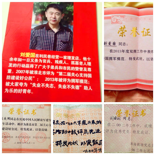 記者了解到,2013年,劉愛國獲得“淮北好人(助人為樂類)”的稱號(hào);2013年,劉愛國被中共淮北市委組織部、市委宣傳部和淮北軍分區(qū)評(píng)為“擁軍模范”。而對(duì)此,他說,這沒有什么值得表揚(yáng)的。