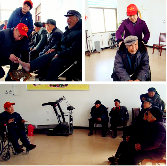 上午9時許,老人陸續(xù)起床,助殘服務(wù)隊員忙活開了。按摩的按摩,剪指甲(趾甲)的剪指甲(趾甲),量血壓的量血壓,大家忙的不亦樂乎。活動最后,殘障人士朱旭東坐在輪椅上為老人講授了一堂別開生面的養(yǎng)生保健課。