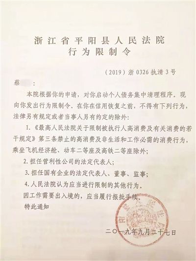 9月27日,平陽(yáng)法院簽發(fā)了對(duì)蔡某的行為限制令,并終結(jié)對(duì)蔡某在本次清理所涉案件中的執(zhí)行。最終,該案得以順利辦結(jié)。