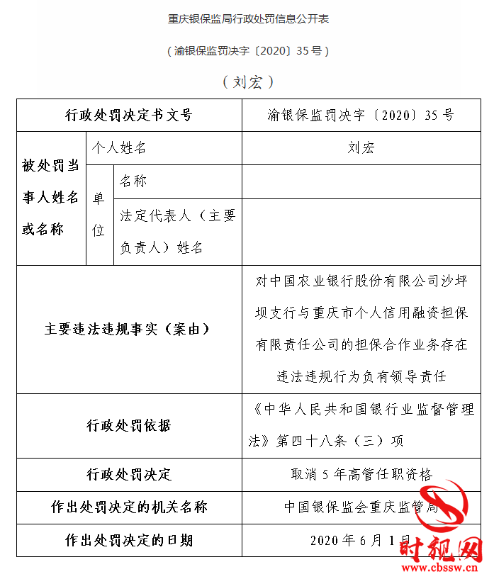 據(jù)中國銀保監(jiān)會(huì)網(wǎng)站6月10日信息,中國銀保監(jiān)會(huì)重慶銀保監(jiān)局公布的行政處罰信息公開表顯示對(duì)中國農(nóng)業(yè)銀行股份有限公司沙坪壩支行與重慶市個(gè)人信用融資擔(dān)保有限責(zé)任公司的擔(dān)保合作業(yè)務(wù)存在違法違規(guī)行為負(fù)有領(lǐng)導(dǎo)責(zé)任。行政處罰依據(jù):《中華人民共和國銀行業(yè)監(jiān)督管理法》第四十八條(三)項(xiàng),行政處罰決定,對(duì)劉宏個(gè)人取消5年高管任職資格。