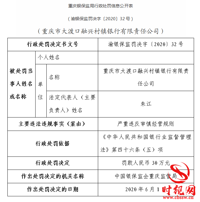 據(jù)銀保監(jiān)會(huì)網(wǎng)站6月10日消息,中國(guó)銀保監(jiān)會(huì)重慶監(jiān)管局公布行政處罰信息公開(kāi)表顯示重慶市大渡口融興村鎮(zhèn)銀行有限責(zé)任公司,主要違法違規(guī)事實(shí),嚴(yán)重違反審慎經(jīng)營(yíng)規(guī)則被行政處罰罰款人民幣30萬(wàn)元。