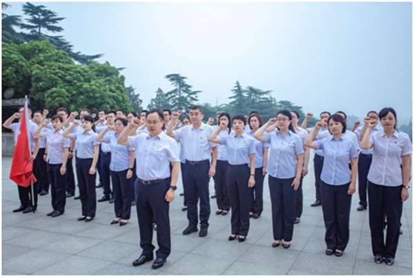 在莊嚴肅穆的紀念塔下,面向鮮紅的黨旗,徐州分行全體黨員莊嚴舉起右手,在黨總支書記的領(lǐng)誓下,重溫入黨誓詞。錚錚誓言,刻劃著每個黨員對黨的初心與忠誠,回蕩在紀念碑的周圍,匯聚成一股磅礴奮進的力量,融入每個黨員的心中。