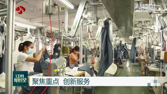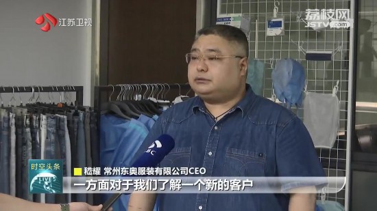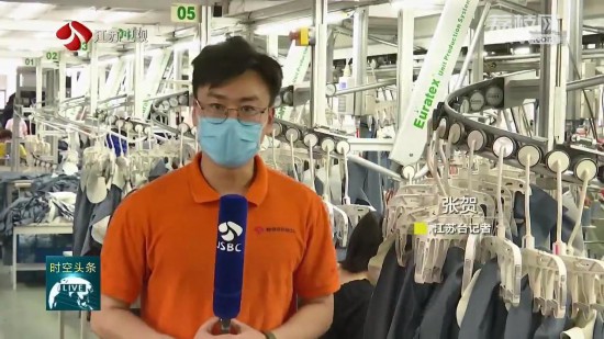 江蘇臺記者張賀說:“這里是位于常州的東奧服裝有限公司的生產(chǎn)車間,現(xiàn)在工人正在忙碌著完成最新一批的海外訂單。作為一家主營牛仔褲的外貿(mào)型服裝制造企業(yè),今年以來,企業(yè)出口額超7500萬美元,同比增長20%。”