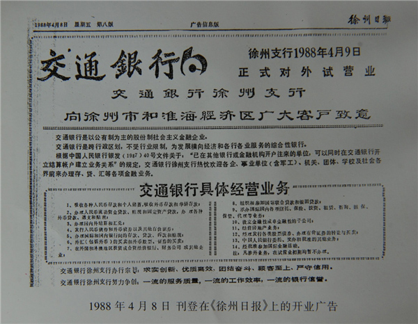 1986年初,覆蓋蘇、魯、豫、皖接壤地區(qū)15個地市的淮海經(jīng)濟(jì)區(qū)成立,徐州以其所處重要的地理交通等區(qū)位優(yōu)勢,具有較為發(fā)達(dá)的工商業(yè),成為這一地區(qū)的中心城市。依據(jù)經(jīng)濟(jì)區(qū)域而不是以行政區(qū)劃設(shè)立分支機(jī)構(gòu),是交通銀行重新組建的一大特色。1988年4月9日,經(jīng)過緊張籌備后的交通銀行徐州支行正式成立并開始試營業(yè),成為該地區(qū)首家不同于其他專業(yè)銀行的股份制綜合性金融機(jī)構(gòu)。