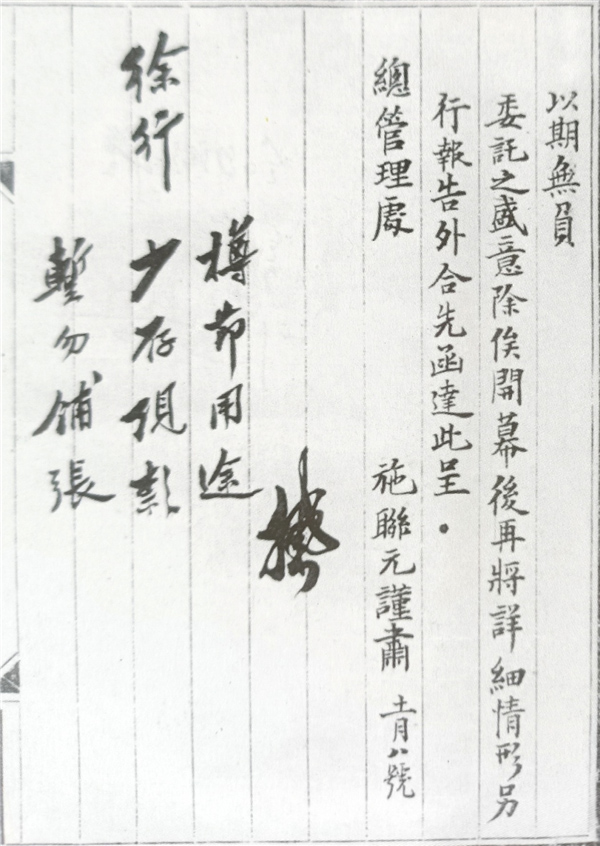 【1913年11月,在交通銀行徐州分行(三等)提請開業(yè)的報告上交行總管理處領(lǐng)導(dǎo)的批示:徐行 撙節(jié)用途,少存現(xiàn)款,暫勿鋪張】